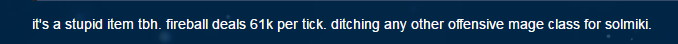 it’s a stupid item tbh. fireball deals 61k per tick. ditching any other offensive mage class for solmiki.