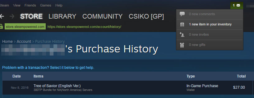 Two days ago I attempted to make a new purchase worth 100 TP, to see if it was just an isolated issue, but the same problem occurred. All purchases went through and processed properly on steams end as well as in my bank account.