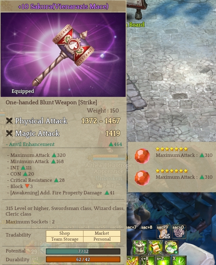 And then, just after the enhancement event ended, I managed to get my second practo. I crafted myself a Vienarazis Mace for my alt to use and began enhancing it. I had a really good streak of successes in a row. Excitedly, I tried it on my main a few times, swapping it with my Windia Rod, to see how the mace stats fared in comparison.