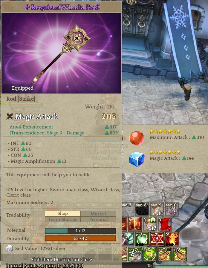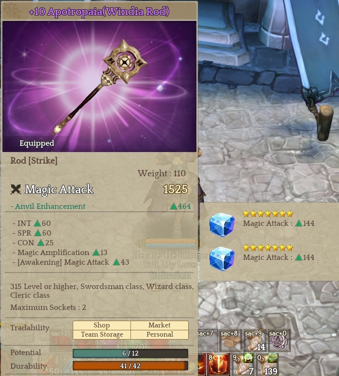 But I’m a Sorcerer… so I couldn’t let myself settle for the Viena Mace. I had to make a new Windia Rod. I harvested the crafting materials and rebuilt my funds, and in a stroke of luck pulled my third ever practo within only three days of my loss. I crafted my reborn Windia Rod. I began enhancing with the leftover anvils from the enhancement event. I had a terrible streak of failures, but I knew I had a stockpile of gold anvils. Eager to finish this and move on with my life, I opened my sockets and began enhancing at 0 potential. After all of that…