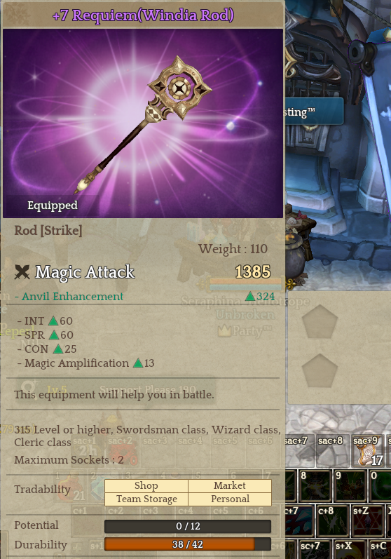 Maybe it’s more than just coincidence that a requiem is a type of song associated with death and mourning, and I’d now gone through two rods named Requiem with depressing results… so, I went all in on the superstition. I had a fresh name and new determination. I held back the urge to spam those anvils while my funds were still low, settling for a +7 at first and then gradually working my way up again. I did all my enhancing on the channel of my lucky number (5), using anvils bought in fives, and later on awakening attempts done five at a time.