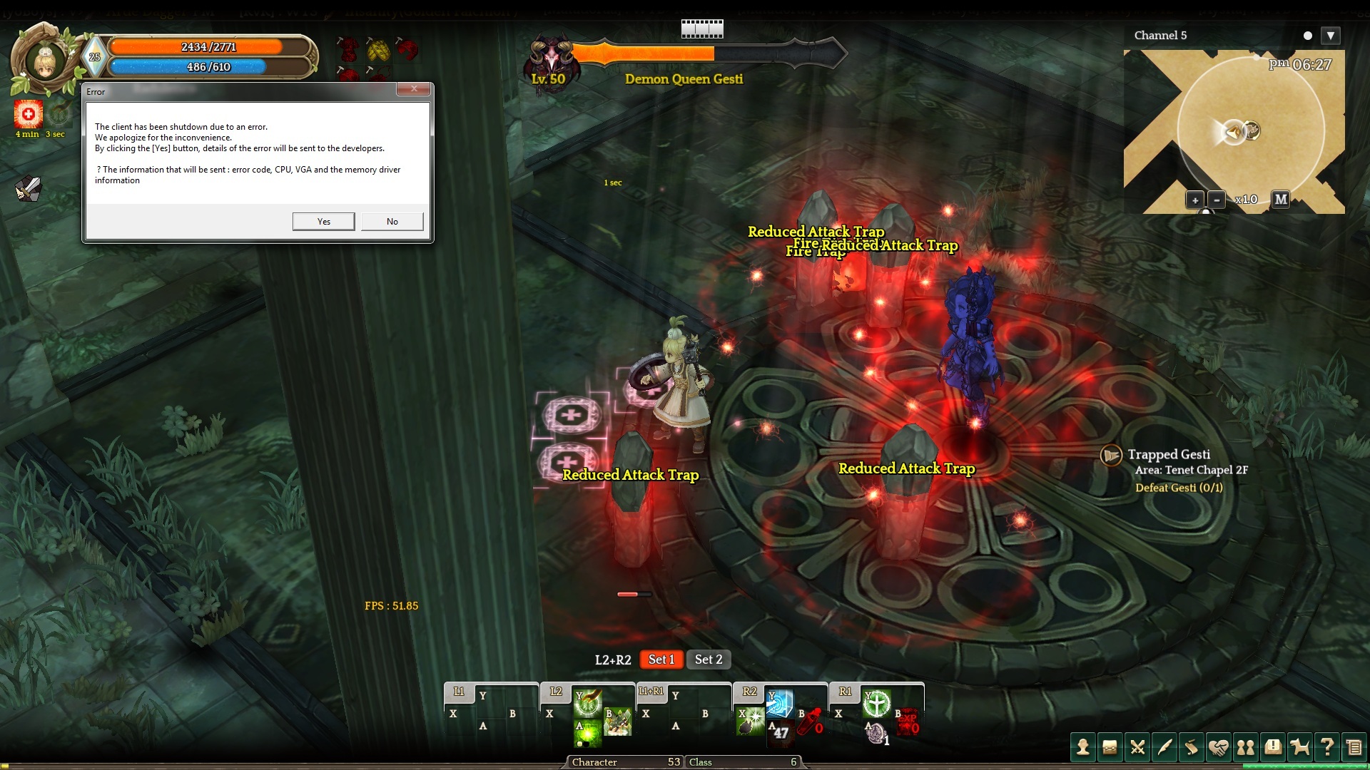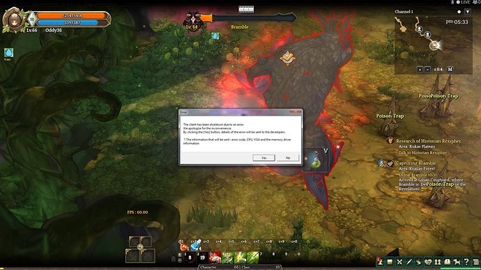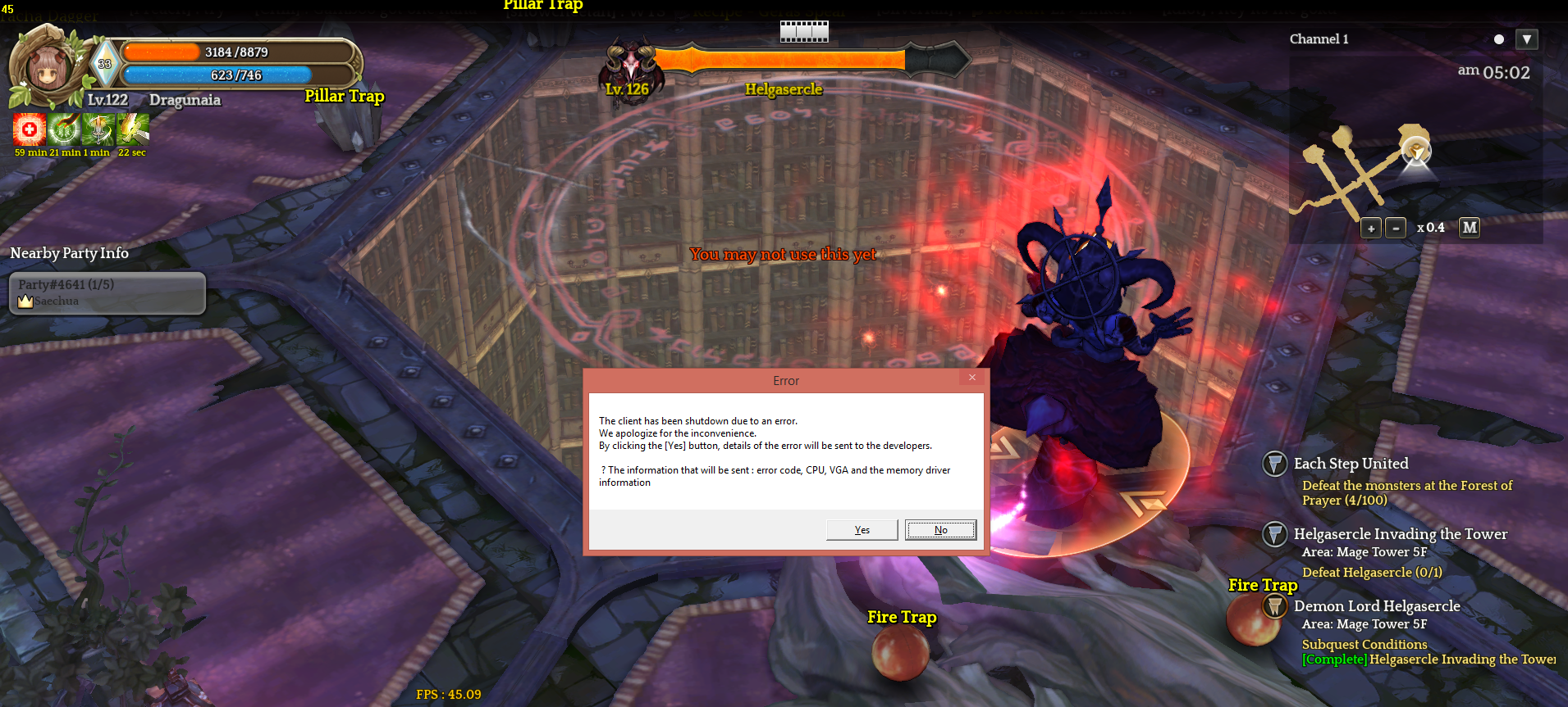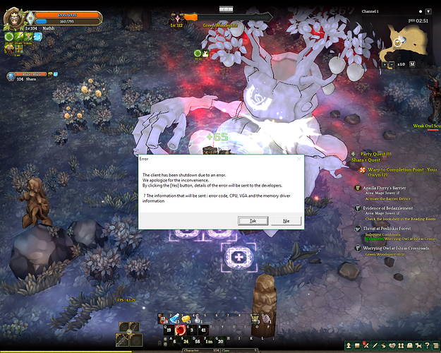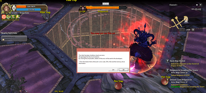 Eh, I’ve tried to finish this boss alone but this time error window pop-up before downing boss HP under 50%. So seems like i cant finish this boss with party or without party. I think its something wrong with client files or maybe server? Because i think my PC is good enough for minimal/recommended i think? BTW. This window show it’s face all time for first time, I had this error before in dungeon 90 lvl +, but that was one time “adventure” with it.
