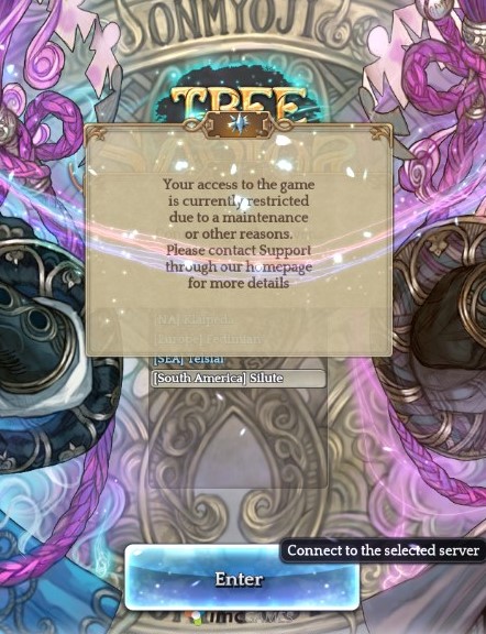 Greetings. I’ve come to claim an alleged message that I get when I try to log in the tree of Savior. I don’t know what happened, because today I could log in normally. Only the server Silute. Please help me.