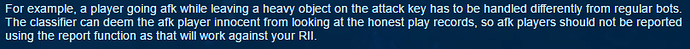 “For example, a player going afk while leaving a heavy object on the attack key has to be handled differently from regular bots.”