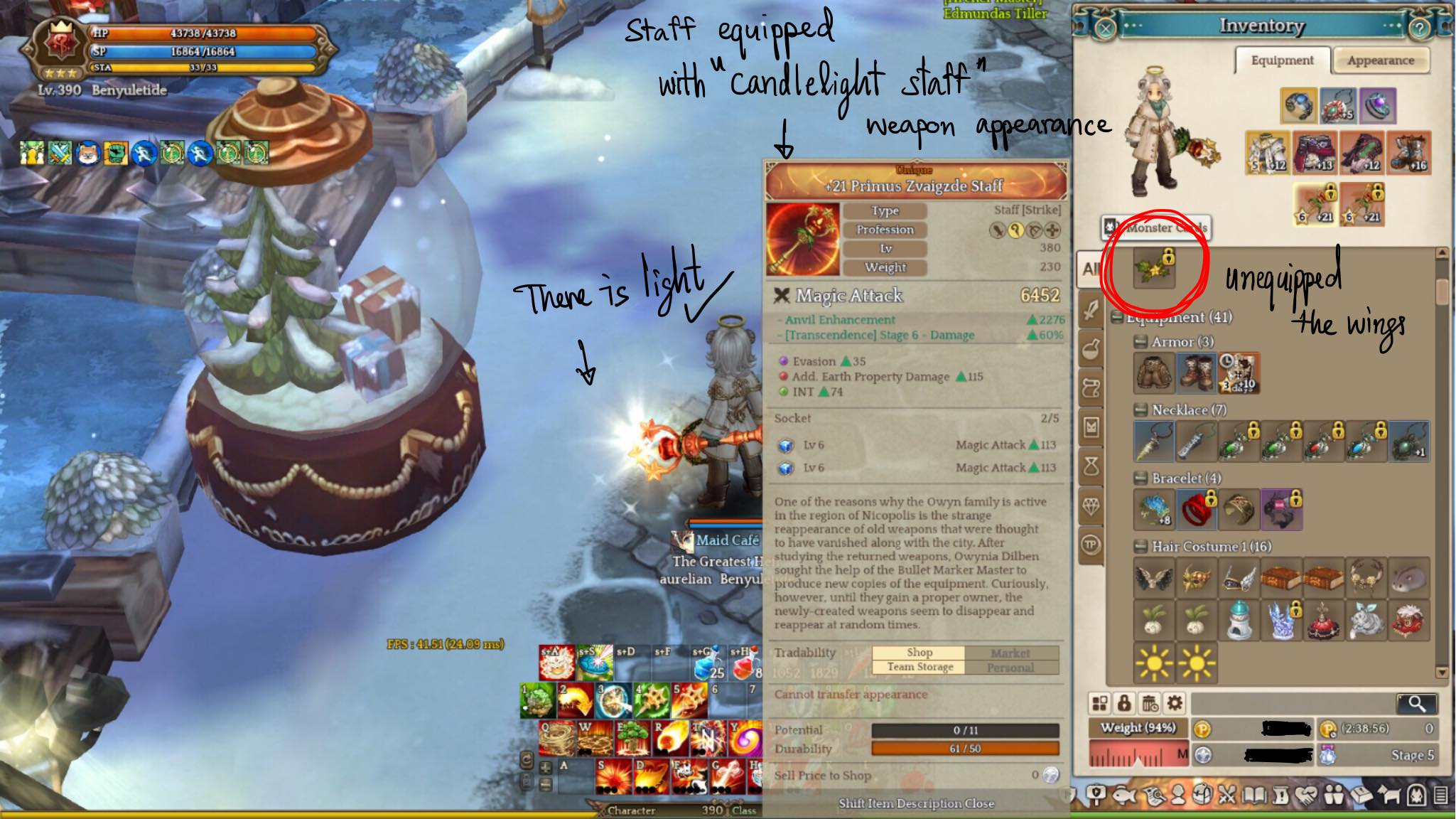 if wearing 2 items, Candlelight staff (weapon appearance) and Shining Star wings at the same time. the light of stars will disappear… sad…