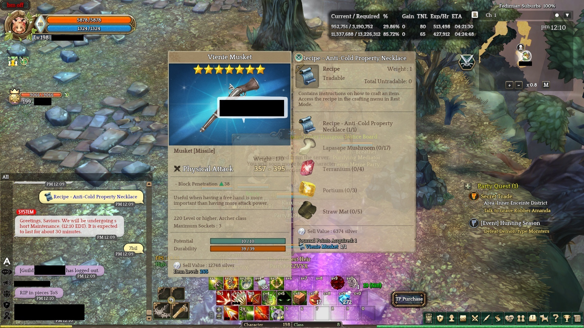 So right before the surprise maintenance at 12:10 server time my group decided to rush the 190 dungeon. On the last boss I supposedly got an Anti-cold property necklace recipe but upon clicking on it I get the Vienie Musket.