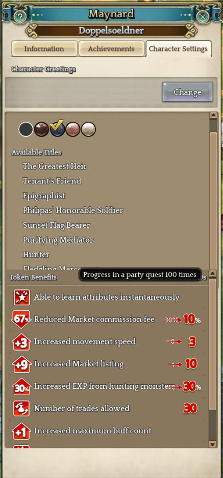 Me and other players have almost 10 titles, but Token Benefits window hides the rest. It’s a little bit hard to find and click in the last one.