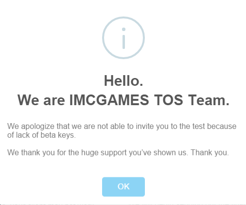 Me wants key,me wants play ToS, me wants candy p.p Oh well i thought i register before u guys giving 2nd beta key. I log in as gmail though and didnt get any verification (though i dont know if u guys sending verification codes) but gib me key o.o