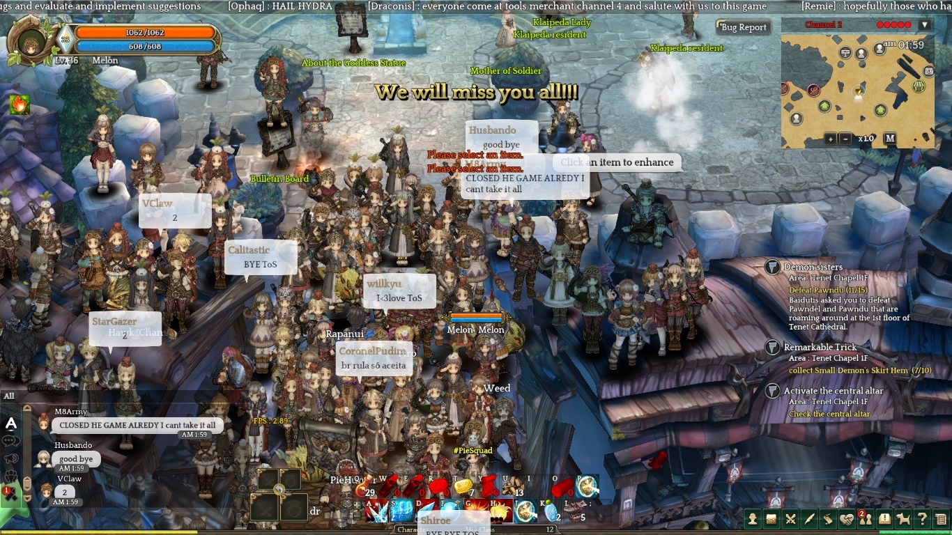 Crap wasn’t able to join this goodbye party because of work!! Game was clearly enjoyable despite of the bugs! Best of luck to the ToS dev team!! Don’t let those bugs bite