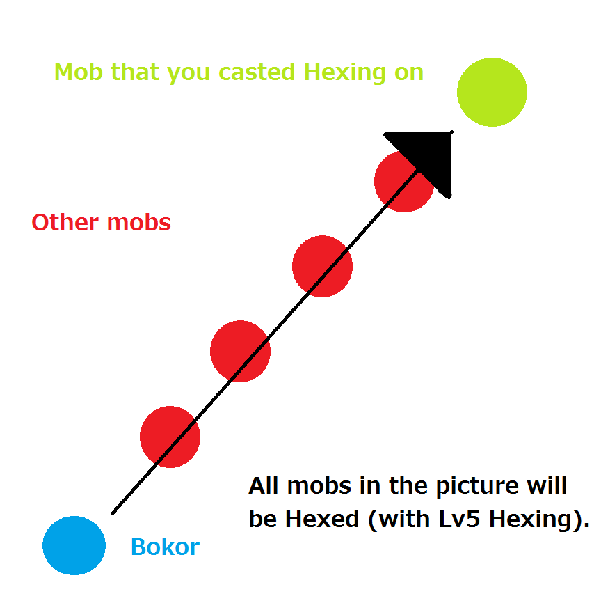 When you casted Hexing on a mob, other mobs (very) close to the target would also be Hexed. What it also did was debuff mobs on the way to the mob you were targeting. For example, if I had 5 mobs in a line and I casted Hexing on the 5th mob (the one at the back) all of them would be Hexed.