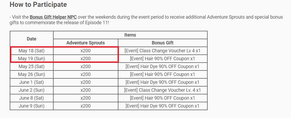 On both Saturday (May 18th) and Sunday (May 19th), the Bonus Gift Helper NPC does not give players their x200 sprouts, but only the Bonus Gift.