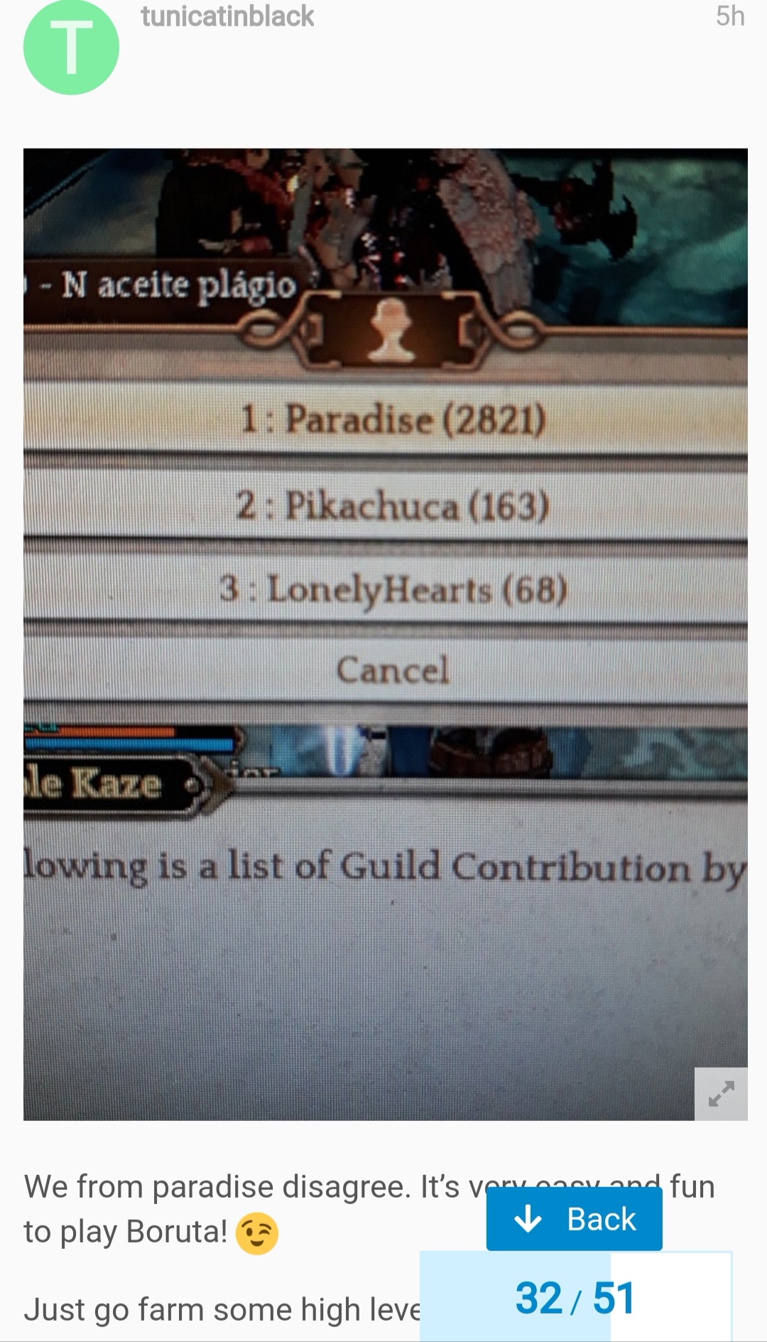 I want to see the new equipment done. No matter who uses it. Even if they are members from the guild that have threatened the server saying no one but your guild would approach boruta or the new equipment.