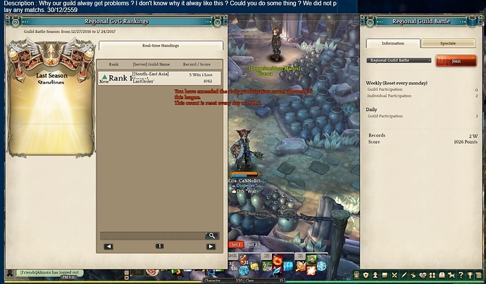 There are 15 members in my guild ,but can join GVG match only 2 people (only me and my 1 guild mate) . It is not the first time for us. last week, We fought Eminence with 5 people ( I can’t take photo because I fighting if you asking for video I can tell you that IT IS REALLY POSSIBLE BECAUSE IT SO LAGGGGGGGGGGGGGGG ) Normally, RPG online game should be able to contain people in the Match more than 40 or over but this game only 20-30 and lag. OMG