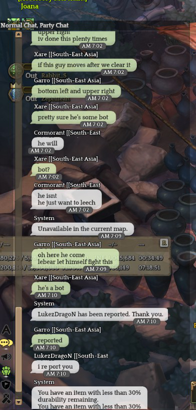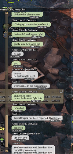 after a short discussion, three of us decided to rush, then this leecher joined in, go stright to the boss door and pretend afk, after we clear the path, took about 50 mins and it was a pain in the ass, he just ran into the boss area and killed the boss. then finally this guy comeup with his first and last word to us… “i re port you”