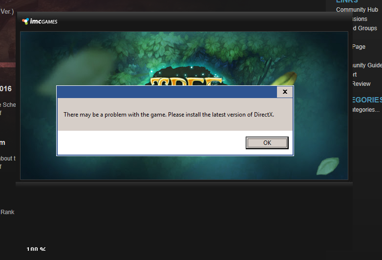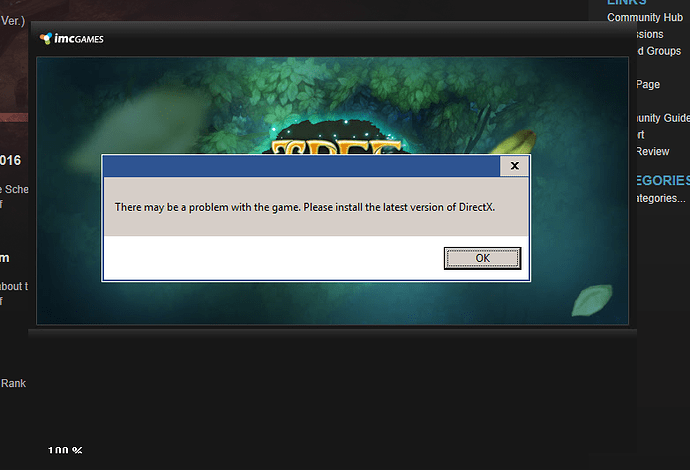 Just today downloaded the game and installed it (or attempted to install it), but whenever I start the launcher, the window freezes at 100%, closes and gives me the error message “There may be a problem with the game. Please install the latest version of DirectX.”