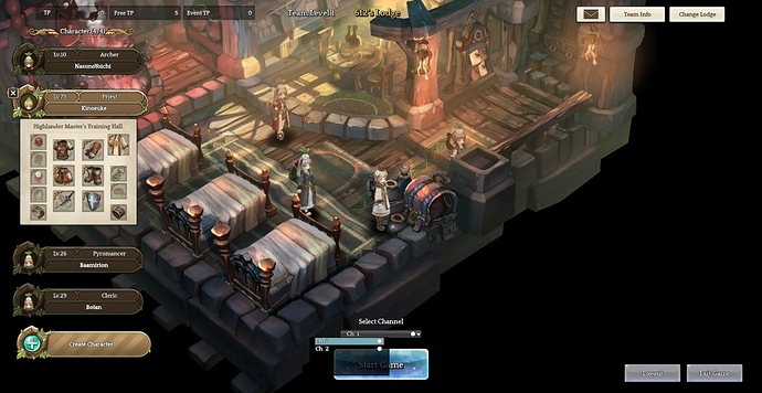 That stuck character’s lodge screen is like this while the others’ are normal with full of listed channels.