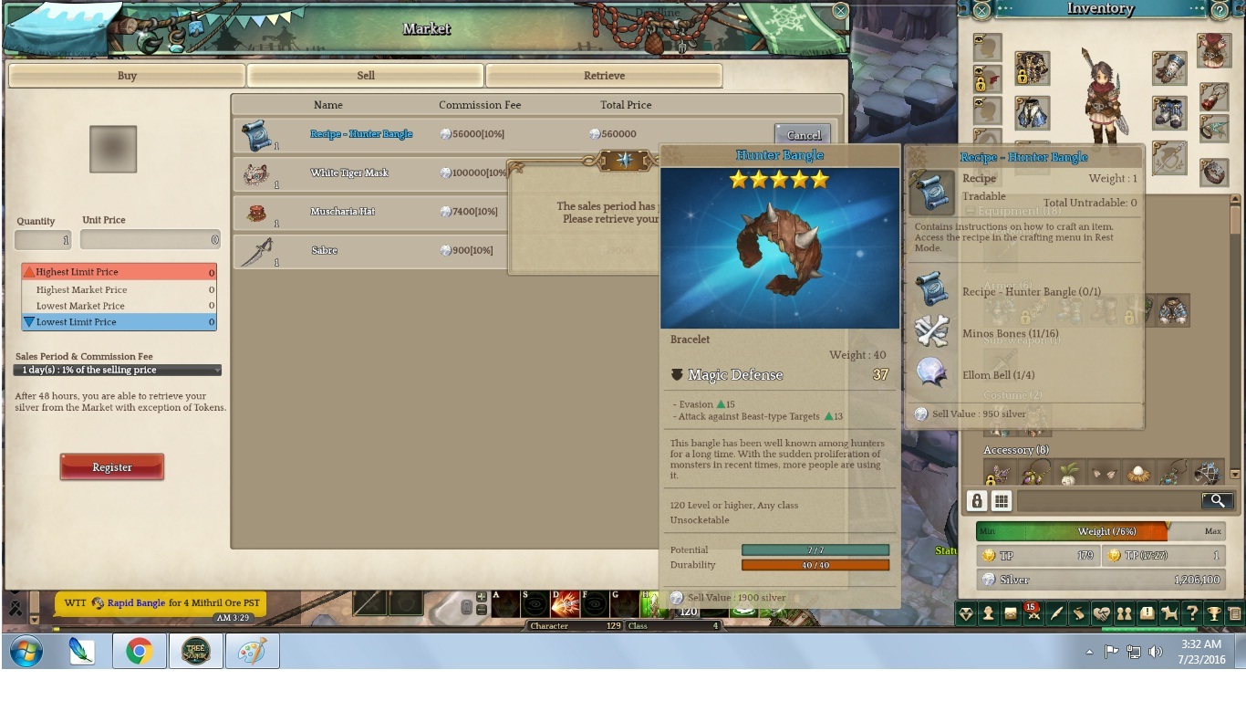Just got back after mage tower quest to retrieve the Item “Hunter Bangle” I sold but it I can’t be retrieved. tried relogging but its still there. It seems to be the infamous market bug whichmakes the item stuck there. I hope this gets fixed.