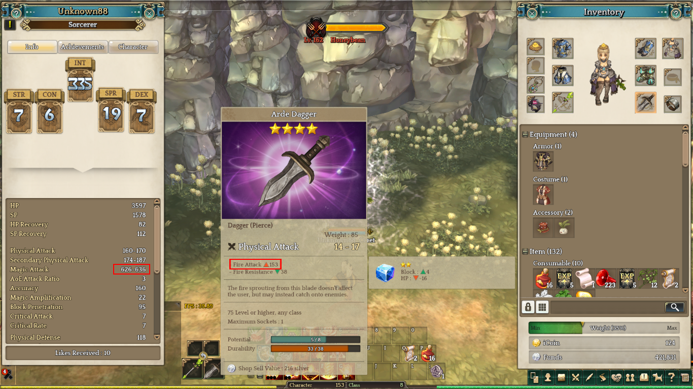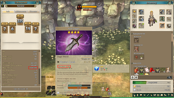 Weapons? I use Rod +17 fire att (Fire Rod), the sub weapon? Arde Dagger(fire att +153) so, My char now att 636+ and extra 170 Fire att.
