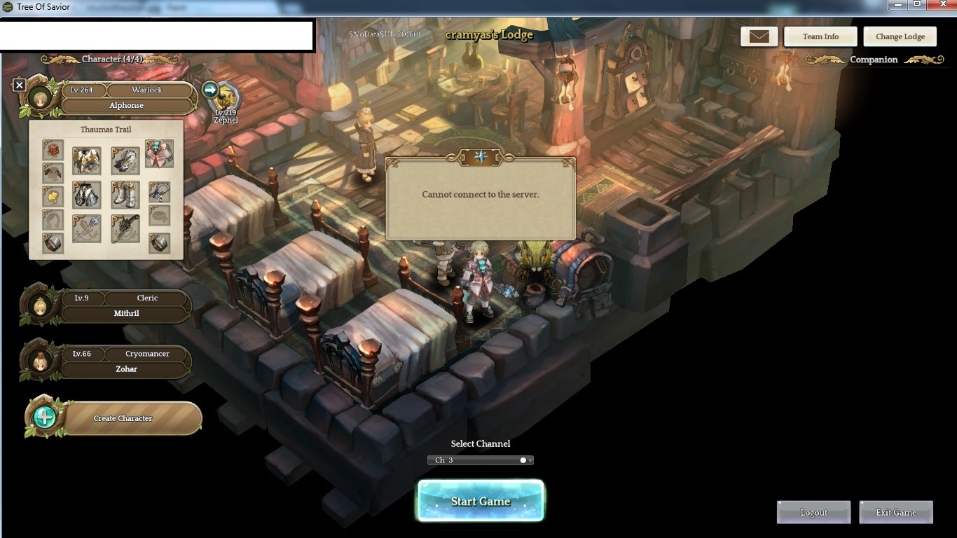All my other characters are accessible, but not my warlock which is stuck in Thaumas.Trails, I was logged out and went back from server select. I tried logging in all different channels, but the same error pops out “Cant Connect to Server”