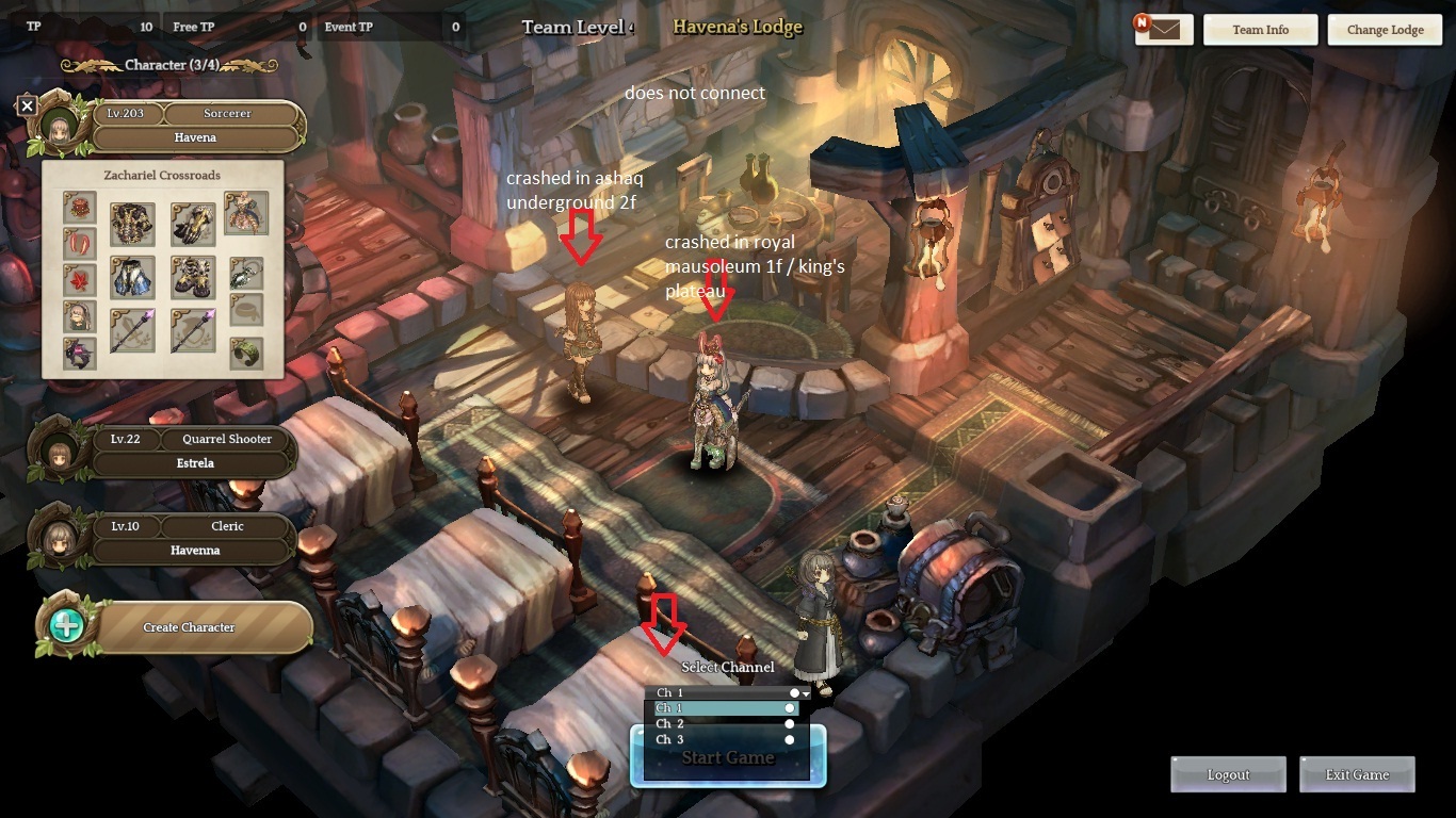 my characters are trapped between the underground ashaq maps 1f and 2f, the other trapped between this royal mausoleum 1f and king’s plateau, when I try to connect back to the login screen and does not connect or to stick !!!