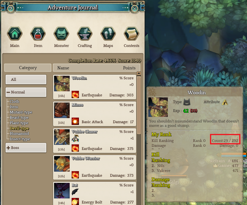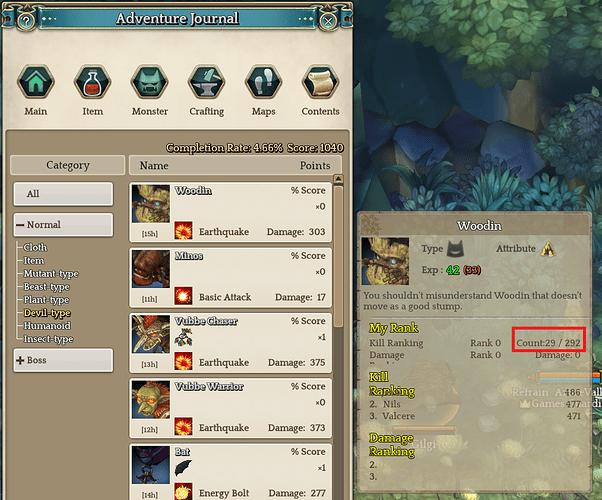 2 - The second point and maybe more usefull is that the adventure jornal gives you exp cards for each number of monster killed that are needed. By pressing F4 and entering on the “Monster” menu, you can see the quantity needed to earn a Exp Card from Lena (Adventure Jornal NPC).