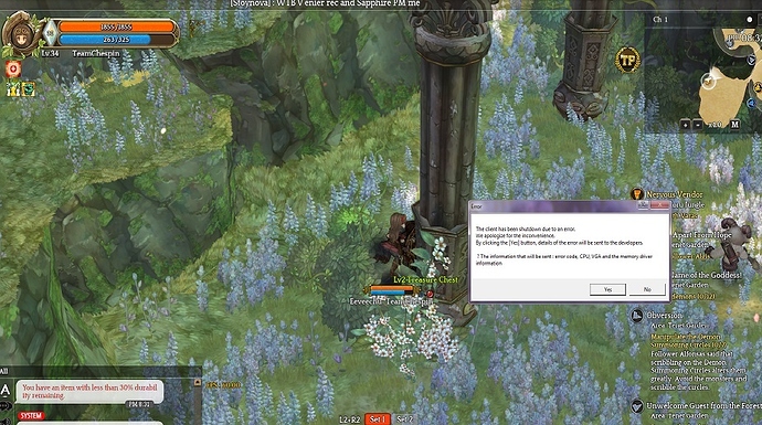 Client crashed when I opened up the treasure box in east klapedia woods to get the maple leaf. It crashed again when I opened the treasure box for the goat horn recipe in tenet garden.