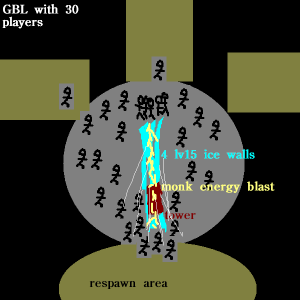 Of course, there should be lots of other skills being used at the same time, but that would make the drawing confusing. Other classes and skills to include in the test are sorcerers with lv15 summon familiar, quarrel shooters with lv15 caltrops, necromancers with lots of minions, elementalists using electrocute on ice walls and placing frost clouds, zaibas, revenged sevenfold, haste, large numbers of buffs cast with max daino making room for them, and of course, melstis keeping everyone’s spells active longer.