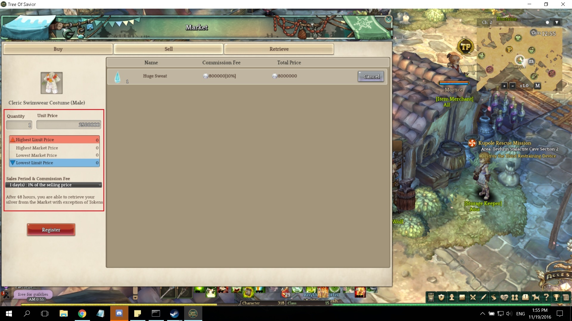 Was selling the Royal Guard Costume in market and keyed in 12,000,000 for the price. Was expecting it registered and logged off. The next time checking it, it was sold for 2,500,000. I tried to recreate the scenario how it happened and it turns out the market auto corrects the silver price keyed in to 2,500,000 as the highest price. even if there is no highest limit price indicator on the screen.
