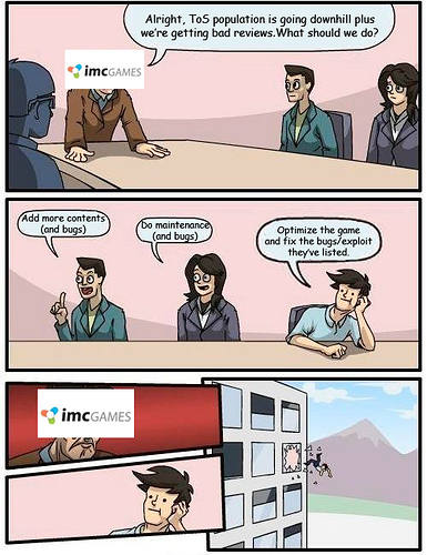 I don’t think people are realizing that the recent reduction of bots is due to the massive loss in value of ToS silver, it can basically be purchased for a dollar per million. IMC has not made any progress in an anti-bot system or made any attempts to answer/address in-game bot reporting. The reduction we are now seeing in bots is the RMT companies moving their resources elsewhere b/c the trading of ToS currency is no longer providing enough profit to cover their expenses. That alone should be far more alarming then another “omfg the game is dying” thread.