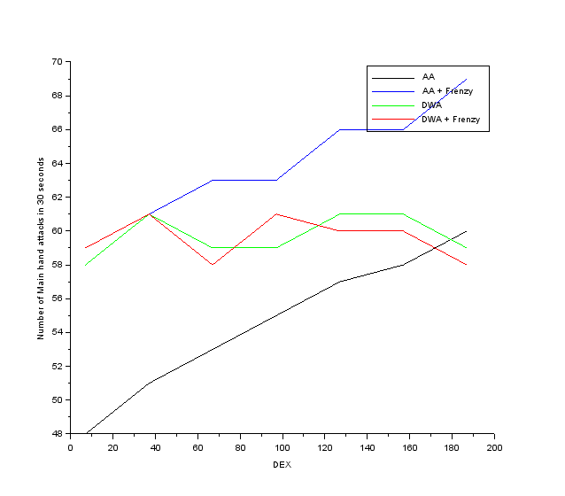I was expecting a small increase in DWA attack speed, half increase of a normal AA would be great, but the data didn’t show that; there is no difference even between DWA and DWA + Frenzy. I’m still doing the test (180 to 360 DEX invested) and the result I’m getting still the same, no increase in DWA attack speed. Maybe we didn’t get this patch from ktos.