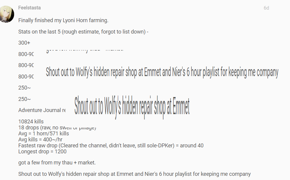 Itâs not about the amount of items that drop, but the satisfaction the players get when obtaining the item. When this information was unveiled the first thing i got were sorrys from my friend who was using my Squire shop and hunting on a different channel that day i got 4 hours straight without a drop.
