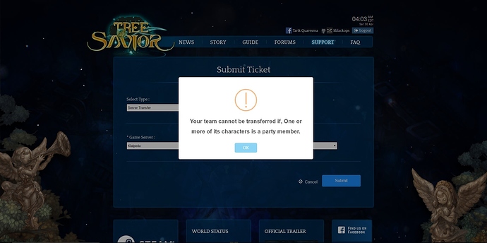 I already left the party, disbanned my pet, took all the itens from the Action House, i did everything that needed, but i could transfer, always showing the massage that couldnt transfer because im in a party. I already opened 2 tickets , 1 from 04/30/2016 and another from 05/02/2016. none of them i got a tip of what to do. I really want to tranfer my character, because i tried when the transfer was opened and i couldnt. All my friends got the transfer, but i didn`t. Could you guys help me on what i need to do to get the transfer done?