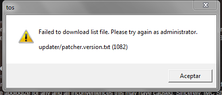 Failed to download list file. Please try again as administrator. Updater/patcher.version.txt (1082)