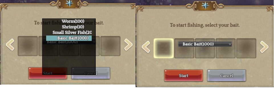 I right click my fishing rod then it ask me to select bait from menu but nothing happens when I click on the bait from the selection menu. The 5 squares are empty. I tried with all the different baits, nothing.