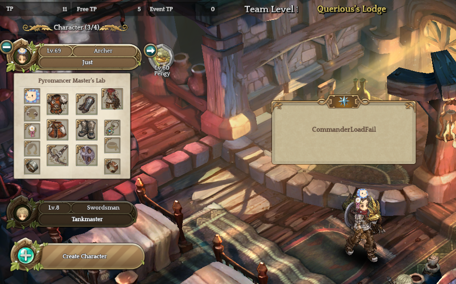 Upon entering the Pyromancer Master’s Lab my game disconnected with the “CommanderLoadFail” error. Further login attempts yielded the same result. I was able to go on other characters, but as soon as another character walks into the map, it is stuck and unable to be logged in.