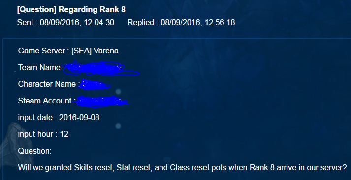 Today I submitted a ticket to ask the support team, will stat, skill, and class reset pots will be given when rank 8 comes. As picture below