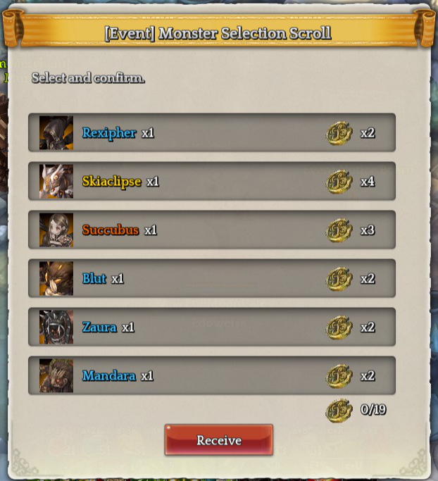 To begin the event you want to select “The Grimoire Master” and then “Obtain daily Coin, Scroll”. You will get 2 items: a [Event] Monster Selection Scroll and a handful of [Event] Ancient Coin. The selection scroll is something you use to purchase monsters. The ancient coins are the currency for purchasing said monsters. You can get more ancient coins by doing various content in the game (like the level dungeon, saalus, etc.).