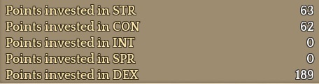 Stat allocation. High Dex, I assume? So it’s going to be 1:2 Str: Dex and left over points into Con. Is this correct?