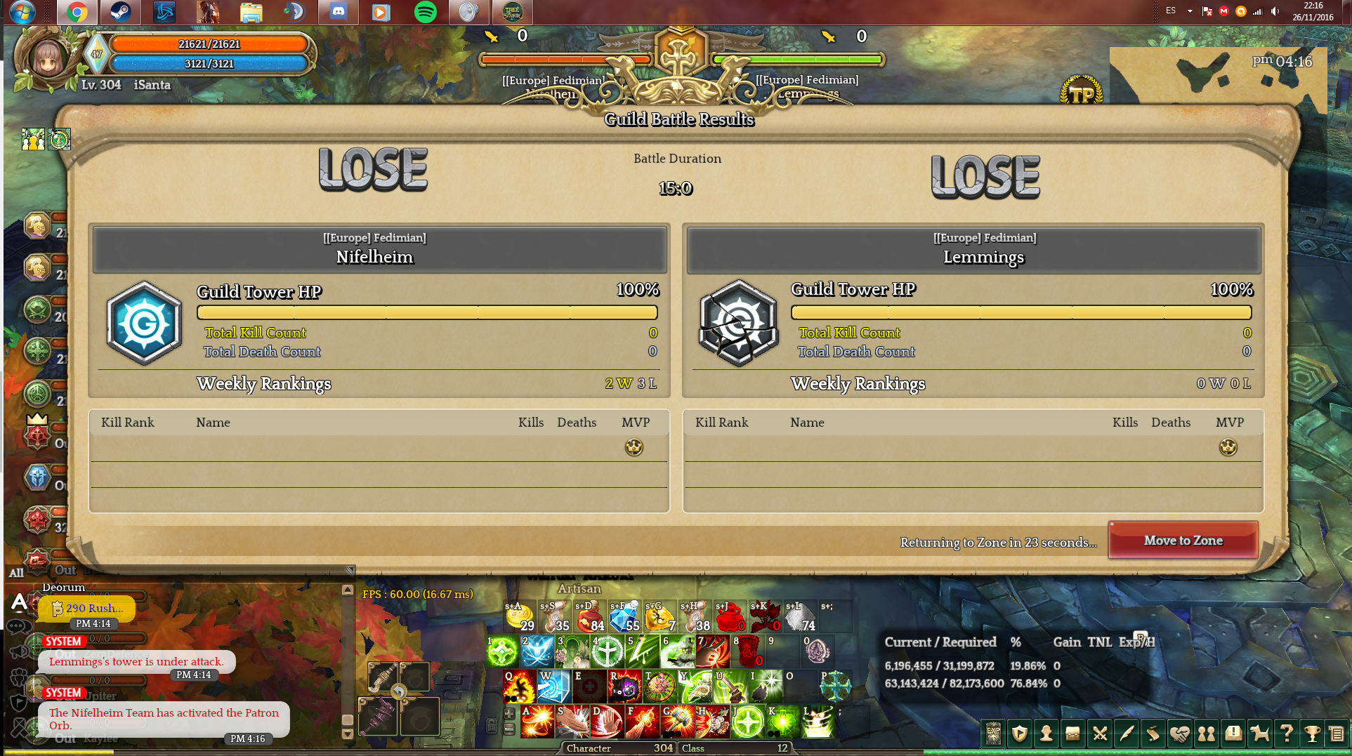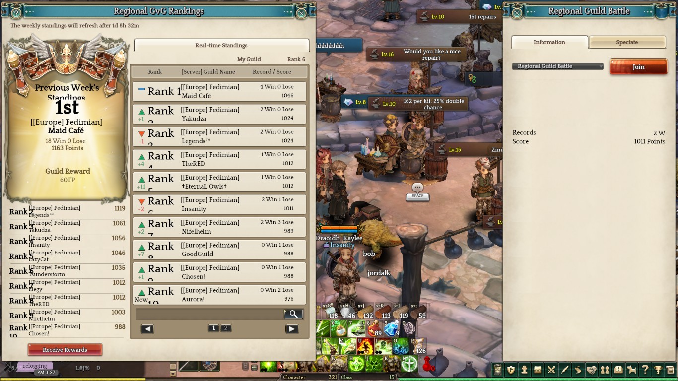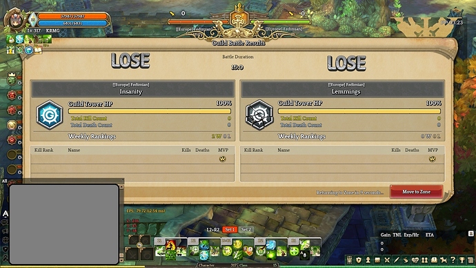 Today the guild Lemming queued against Insanity and Legends and all their members left the match so that we weren’t capable of killing anyone or kill their guildtower. This meant waiting 15min in GvG just to have a 0:0 situation and loosing our 3rd rank.