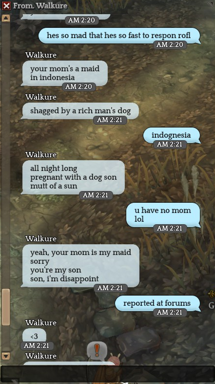 With all due respect, you guys need to learn to block people and move on. That is not harassment. Stalking you around and KS’ing you through multiple channels, spamming Red Orbs spawns onto lower-level players, repeatedly insulting and/or spouting racism comments on the Shout chat, THAT is harassment. Getting into an argument with a guy in whisper, is not. You even joined in by insulting him back, as shown in your screenshot, so with your logic shouldn’t you both be punished?