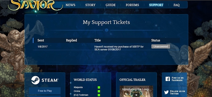 Hi! Please help me! I bought at 8:25PM 01/08/2017 Philippines time and have not received anything ingame. I have checked my mail and visited all server in case i made a wrong purchase and nothing. I also checked my mail, if the purchase was not made, but i received an email telling me my purchase was successful. Also checked with steam purchase history, and it says i have made the purchase using Steam Wallet. Where did it went wrong?