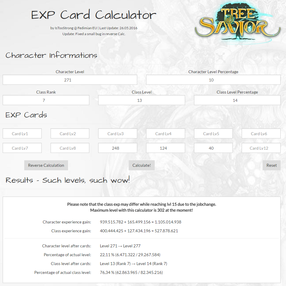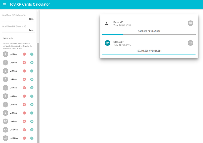 http://expcardcalculator.com/ http://lubien.me/tosxp/ http://tosexp.hakto.net/index.php