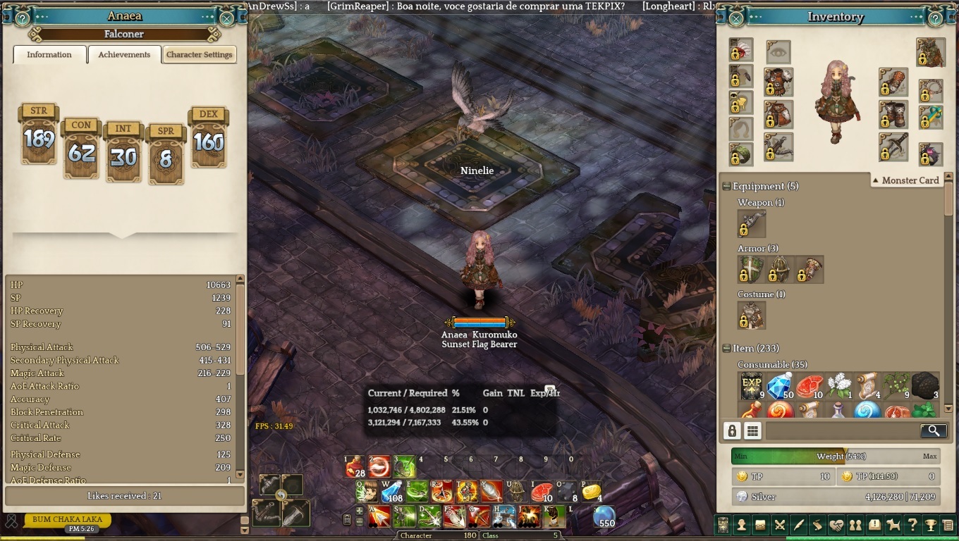 I have 4kk to spend with Manamana, but no one selling the recipe… 3.8-4kk in Silute server, it’s so expensive, and I don’t know why, 3 days ago was 2.8-3kk, and Honeymeli… 60-80k each, and the drop 3.3% or less, idk ¬¬ … tsc, also, what I do? (A2, Q3, Falconer 1 atm Lv 180) buy a Isbality or what? I can farm, but took 4ver to make 400k a day >_> (I can’t see anymore my arde dagger, seriously, it’s so weird)