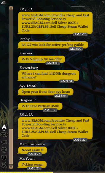 The situation isn’t that bad now because when these spam bots get banned, they aren’t able to refund since they’ve played over 2 hours to level up. This means, the gold seller has to pay 10 dollars for each of their rather short lived advertisement. I’m rather sure they won’t gain 10 dollars back from them.