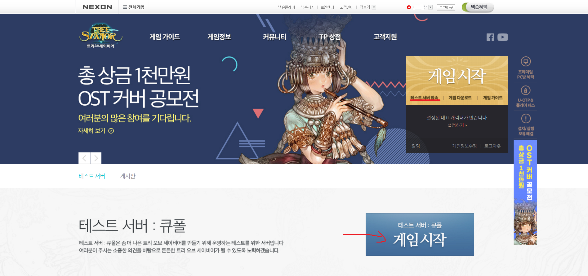 After the unchecking, clicking the TOS Test button that should have been installed to your desktop, it will now navigate you directly to the main site, you can then login using the navigation bar at the top or the golden button gamestart ‘게임 사작’ will prompt you to login, after login you need to go to here which is the kupole test server page index, you can also access it from under the gamestart button via an option to be taken to the page (테스트 서버 접속)