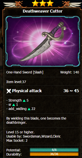 For example, the Deathweaver boss in the mines drops possibly the best lvl 15 weapons for every class- this is the stats for the 2 handed sword. Note that the stars (item level) is higher for purple weapons, then the average blue/white weapon.