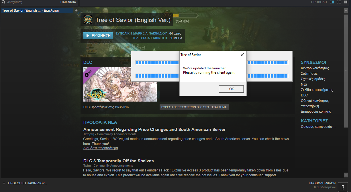 When i try play ToS from steam i get this bar filled and this message, when i press Ok nothing happens, when i try restart the game, Steam says the game is already running and cant restart it but the game is nowhere, please help me, i have payed for this game and it wont let me enjoy it