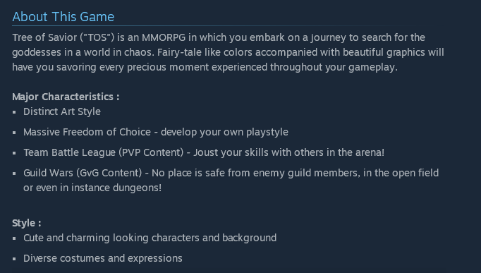 "Tree of Savior(abbreviated as TOS thereafter) is an MMORPG in which you embark on a journey to search for the goddesses in the world of chaos. Fairy-tale like colors accompanied with beautiful graphics in TOS will have you reminiscing about precious moments all throughout the game."