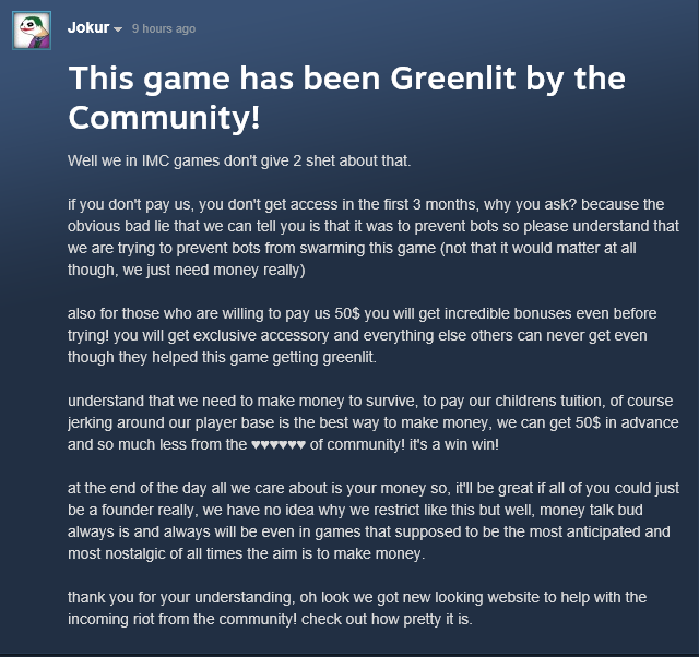 i agree to more patient guys who didn like the idea of announcing this stuff a few days before it actually happens like “hey guys today you can purchase founder packs and in a few days the first server gonna open” - ive said that in one of my earlier comments already that this is a part i disagree to IMC - imagine there was no early access and everything was free - imc announces “hey we gonna open server tomorrow” you think the guys i mentioned above would still be unhappy? nope theyre not cause they wanna be fed with free stuff thats their only concern - people who disagree with short term decisions would STILL disagree on an opening if it was already tomorrow! cause such announcements are kinda…well too late idk how to say that xD