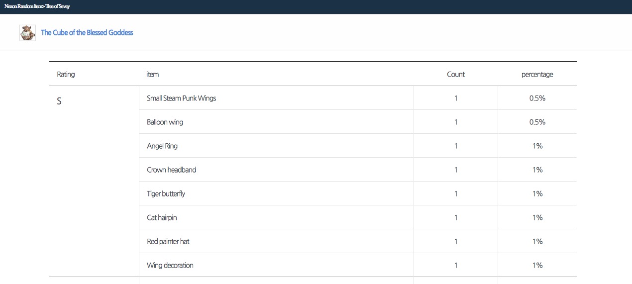 Browsing the Korean site I came across a very interesting thing, there they have a page that says the percentage of EVERY ITEM that can go out in the Goddess Cube, while you here just warn the general percentage of RANK …